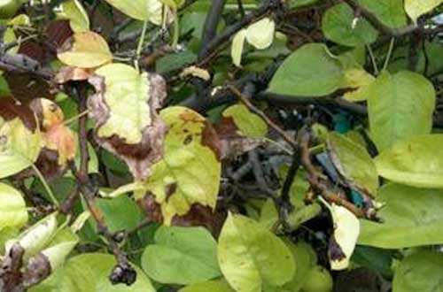 近年來,梨樹黃化病發(fā)生很普遍,從幼苗到成樹各個(gè)階段都有可能發(fā)生,表現(xiàn)癥狀一般從新梢開始,葉色由淡綠變成黃色,僅葉脈保持綠色,嚴(yán)重發(fā)生時(shí)整個(gè)葉片是黃白色,在葉緣形成焦枯壞死斑。發(fā)病的新梢枝條細(xì)弱,節(jié)間延長(zhǎng),腋芽不充實(shí)。形成這種黃化的原因是缺鐵,因此又稱為缺鐵癥。有時(shí)在新梢停長(zhǎng)或雨季到來后梨樹的黃化癥狀有所減輕。
