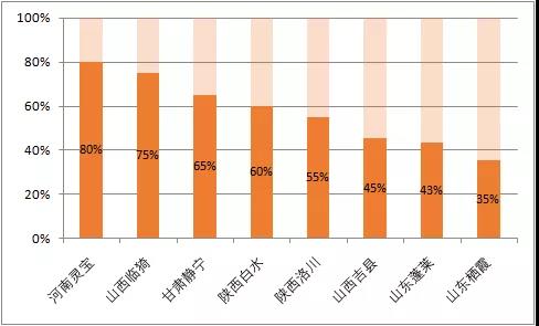 以庫存蘋果銷售完成的平均比例多少為序,現在的基本動態調研判斷情況如下:河南靈寶80%,山西臨猗75%,甘肅靜寧65%,陜西白水60%,陜西洛川55%,山西吉縣45%,山東蓬萊43%,山東棲霞35%。